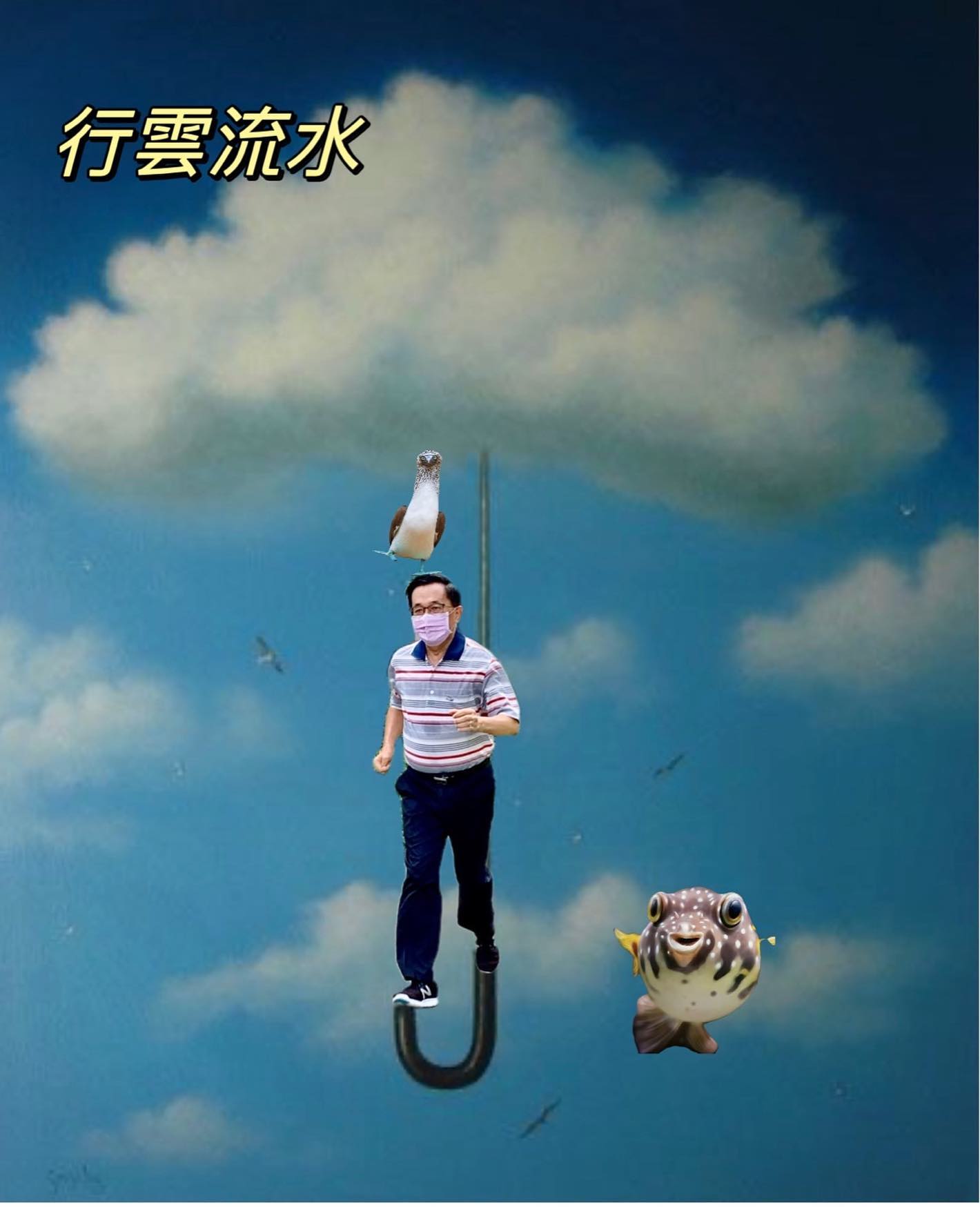 The third image also features the seated Chen image, though this time there is an industrial background. The Chen doppelganger featured this time is running, while the image also shows two figurines and a caricature of Don Quixote. The text reads “Taiwan Warrior.” Since then, Chen has released a few more images, such as of himself sitting awkwardly on a giraffe, or underneath a cloud-shaped umbrella.